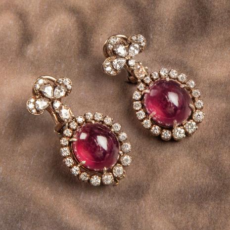 An open setting earring featuring a flower-shaped top adorned with dazzling moissanite and vibrant rubies.