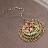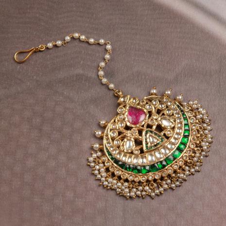A dual crescent-shaped tikka adorned with emeralds, rubies, and moissanite, accentuated by a central red leaf motif and complemented by dangling pearls, showcasing exquisite craftsmanship and opulent charm.