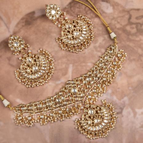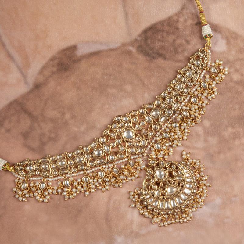 A Jadau necklace set plated with 22k gold, featuring moissanite stones and a design inspired by antique hanging motifs, complemented by a Chand Tikka.
